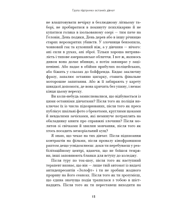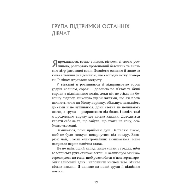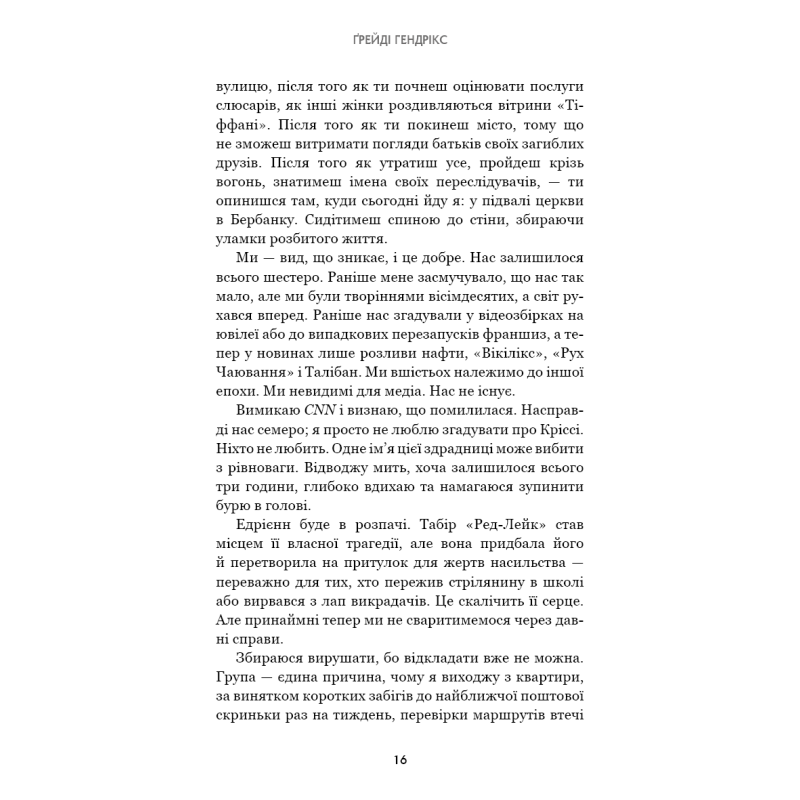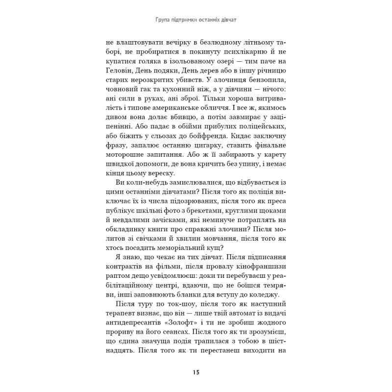 Коли наприкінці фільмів жахів на екранах з’являються титри, останні дівчата продовжують стояти. Вони пережили найстрашнішу ніч у своєму житті... але що буде далі? Як і бестселер «Посібник зі знищення вампірів від Південного книжкового клубу», новий роман Ґрейді Гендрікса — це стрімкий, страхітливий і зловісно непередбачуваний трилер. Ліннет Таркінгтон пережила криваву різанину, в якій убивця жорстоко розправився з її родиною та поліцейським. Протягом шістнадцяти років вона відвідує групу психологічної підтримки, де разом із п’ятьма іншими дівчатами з подібним досвідом намагається подолати наслідки травми й почати нове життя. Так триває доти, доки одна з жінок не пропускає зустріч. Зважаючи на всі обставини, справджуються найгірші побоювання Ліннетт: хтось знає про групу й вирішив знову зруйнувати їхні життя. Але особливість останніх дівчат полягає в тому, що тепер вони мають одна одну, і хоч якими мізерними не були б шанси, якою темною не виявилася б ніч, яким гострим не був би ніж, вони ніколи, ніколи не здадуться.