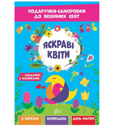 Книжка «Яскраві квіти» із серії «Подарунки-саморобки до весняних свят» допоможе дитині легко підготувати гарні подарунки до 8 березня, Великодня та Дня матері. У ній зібрано багато простих і захопливих ідей для створення виробів своїми руками. Кожна саморобка супроводжується переліком необхідних матеріалів і зрозумілою покроковою інструкцією з ілюстраціями, тож процес буде зручним і цікавим. Працюючи з книжкою, дитина зможе виготовляти весняні прикраси, квіткові композиції, аплікації та листівки, а також виконувати творчі завдання. Яскраві тематичні наліпки зроблять заняття ще веселішим. Видання не лише дарує приємне дозвілля, а й сприяє розвитку дрібної моторики, уважності, логічного мислення, уяви та творчих здібностей. Книжка розрахована на спільну роботу дорослих із дітьми дошкільного та молодшого шкільного віку.