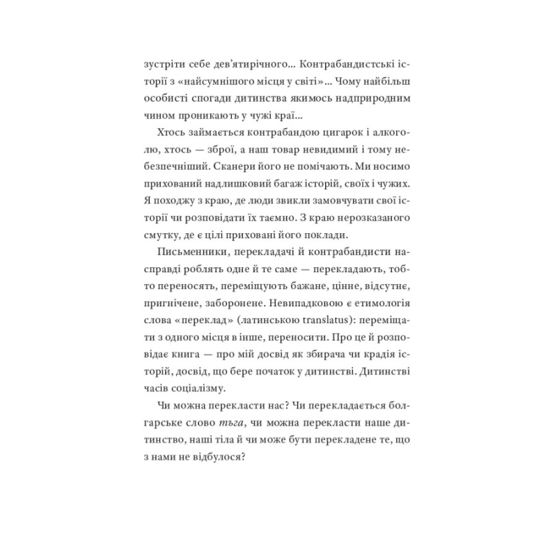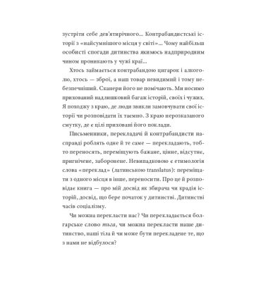 Цією оповіддю Ґеорґі Ґосподінов запрошує читача у звивисту подорож власними спогадами. Це щира, а тому місцями й щемлива, розповідь письменника про себе: своє дитинство, родину й мовно-культурну самобутність своєї країни, в якій особливе місце займає невимовна особлива тъга, той багаж, що його накопичили багато поколінь. Автор зазирає в глибини свого буття — і відкриває нам таємниці творчості й народження себе як письменника, знайомлячи нас водночас зі своєї батьківщиною. ...Хтось займається контрабандою цигарок і алкоголю, хтось — зброї, а наш товар невидимий і тому небезпечніший. Сканери його не помічають. Ми носимо прихований надлишковий багаж історій, своїх і чужих. Письменники, перекладачі й контрабандисти насправді роблять одне й те саме — перекладають, тобто переносять, переміщують бажане, цінне, відсутнє, пригнічене, заборонене...