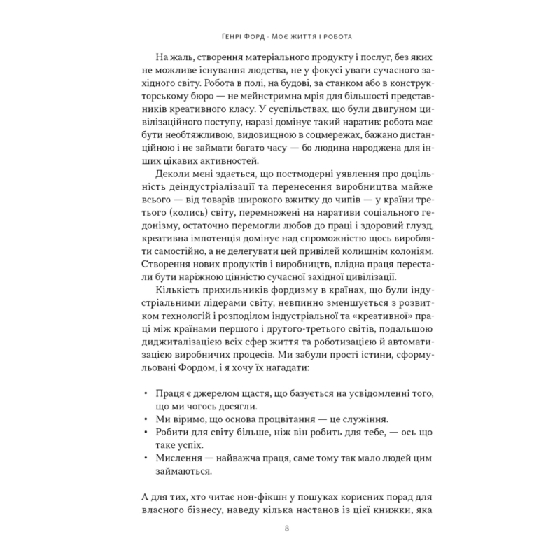 Про Генрі Форда ще за його життя складали легенди, та й досі певні факти його біографії не є остаточно підтвердженими чи спростованими. Проте, незаперечним залишається те, що сенсом його життя була робота. Понад усе Форд прагнув створити машину, яка працюватиме вічно. На шляху до втілення мрії він завдяки вірі у неможливе здійснив переворот у мисленні власного оточення й майбутніх поколінь, які теж змінили своє ставлення до грошей, успішного бізнесу й роботи. Форд вважав, що саме мислення є найважчою роботою, на яку здатна людина. Це, ймовірно, є причиною, чому ми маємо так мало мислителів. Форд невтомно шукав відповіді на складні питання людської історії, як-от: чому існує бідність; що робить гроші грошима і які можливі трюки в рамках нинішньої фінансової системи, через які різні нації й народи потрапляють під контроль небагатьох людей; чого очікувати від майбутнього...