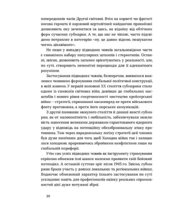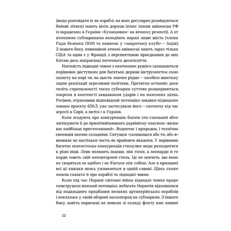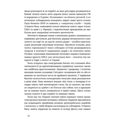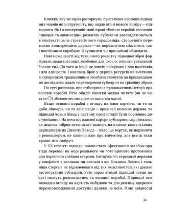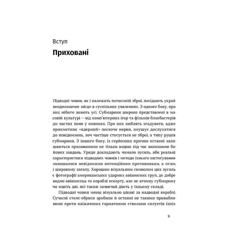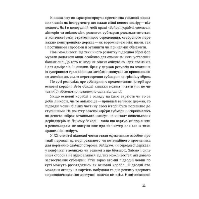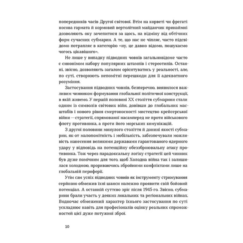 Нова книжка військово-морського експерта Максима Паламарчука занурює нас в історію чи не найбільш утаємничених носіїв морських озброєнь — підводних човнів. Субмарини починали свій шлях як засіб берегової оборони і згодом перетворилися на небезпечне знаряддя сучасних війн, що має величезний потенціал, зокрема завдяки безекіпажним апаратам. Першого бойового успіху підводний човен досяг ще під час Громадянської війни в США, а в Першій і Другій світових війнах дії субмарин мали вже вагомі стратегічні наслідки. Надання доступу до відповідних технологій визначало позиції держав під час Холодної війни. Невидиме підводне протистояння й до сьогодні впливає на перебіг конфліктів, ефективність дипломатичних зусиль з їхнього вирішення та врешті-решт на глобальний розподіл влади.