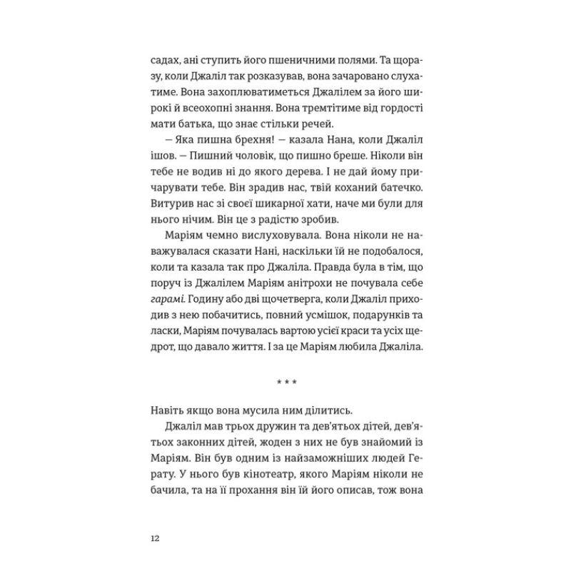 «Тисяча осяйних сонць» — другий роман афгано-американського автора Халеда Госсейні, у якому переплітаються долі двох жінок на тлі страшних подій в Афганістані ХХ століття. Маріям з раннього віку засвоїла, що як стрілка компаса завжди вказує на північ, так і звинувачувальний палець чоловіка завжди вказує на жінку. А ще, що жінкам потрібне в житті тільки одне вміння, якого не вчать у школі: тагаммуль — терпіння. Маріям було лише п’ятнадцять, коли її відправили з села до Кабулу і змусили вийти заміж за набагато старшого Рашіда. Лайла зростає на сусідній вулиці, і, здавалося б, її чекає зовсім інша доля, адже її родина сучасна та прогресивна. Однак лихоліття війни руйнує все: мрії, надії, сподівання… Коли до влади остаточно приходить Талібан, життя людей перетворюється на безрадісне існування в голоді, насиллі та страху. Чи можливо серед тієї чорноти відшукати крихти щастя? Дивовижно, але любов здатна надавати неймовірної сили, вчить діяти за покликом серця, а часом і жертвувати собою, рятуючи інших. Любов дає наснаги тривати у найважчих умовах із подиву гідним героїзмом.