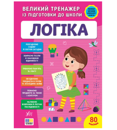 У книжці «Логіка» дитина виконуватиме різноманітні завдання з предметами: доповнюватиме групи, знаходити зайве або об’єднуватиме за спільними ознаками. Вона вчитиметься встановлювати послідовності, працювати по пам’яті, визначати частини цілого, розпізнавати фігури з різних ракурсів і впізнавати тварин за тінями. Також у книзі є вправи на пошук помилок у малюнках, складання пазлів, відновлення зображень за зразком, малювання візерунків по клітинках і навіть розгадування судоку. Окремо приділено увагу правилам дорожнього руху та безпечній поведінці вдома — дитина запам’ятає дорожні знаки та їх значення. Завдання доповнені наліпками, що робить навчання цікавішим. Книжка допомагає розвивати дрібну моторику, увагу, пам’ять, уяву й логічне мислення та сприяє якісній підготовці дитини до школи.