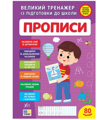 У книжці «Прописи» дитина опановуватиме друковані літери українського алфавіту, вчитиметься впізнавати їхнє графічне зображення та визначати місце в слові. Також вона малюватиме прості фігури, виконуватиме штрихування та тренуватиме різні напрямки ліній — лівою і правою рукою по черзі або одночасно. Завдання включають обведення по пунктиру елементів сюжетних малюнків, їх розфарбовування, повторення ліній і зображень по точках, а також домальовування частин малюнка чи відтворення зображення повністю за зразком у клітинках. Книжка містить ігрові вправи з наліпками, що робить навчання більш захопливим. Такі завдання сприяють розвитку дрібної моторики, координації рухів, уваги, пам’яті, уяви та логічного мислення і допомагають дитині якісно підготуватися до школи.